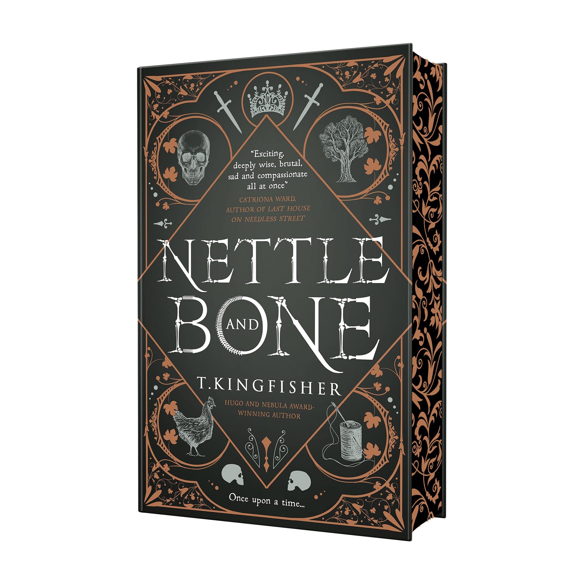 This customised hardcover edition of  ”Nettle and Bone by T. Kingfisher” will come with a choice of this gorgeous design on the front, and plain coloured edges on the top and bottom. The edges will NOT be metallic but an orange/brown colour matching the cover.