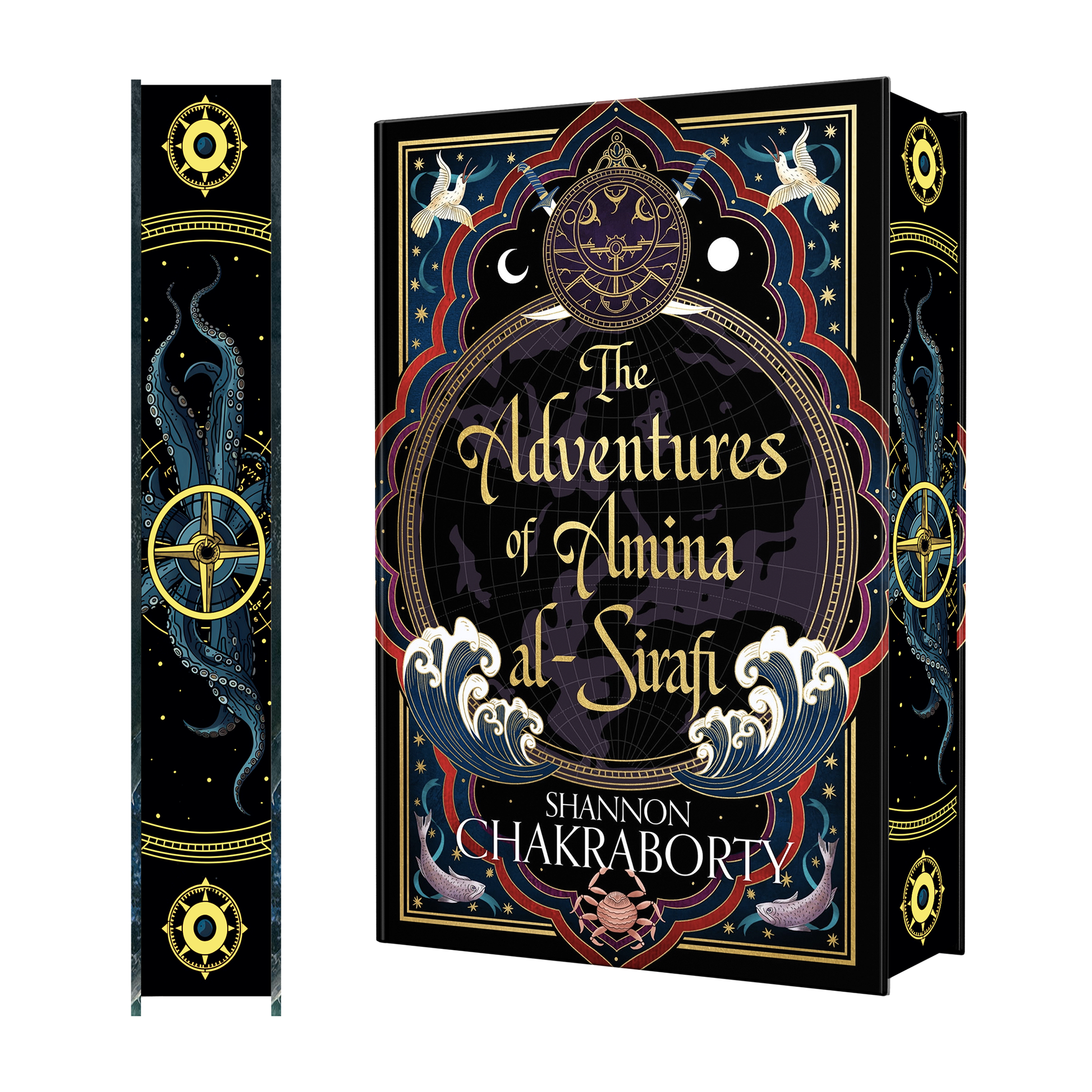 This gorgeous customised hardcover edition of The Adventures of Amina Al-Sirafi by Shannon Chakraborty, will come with this stunning design on the front and solid edges on the top and bottom.