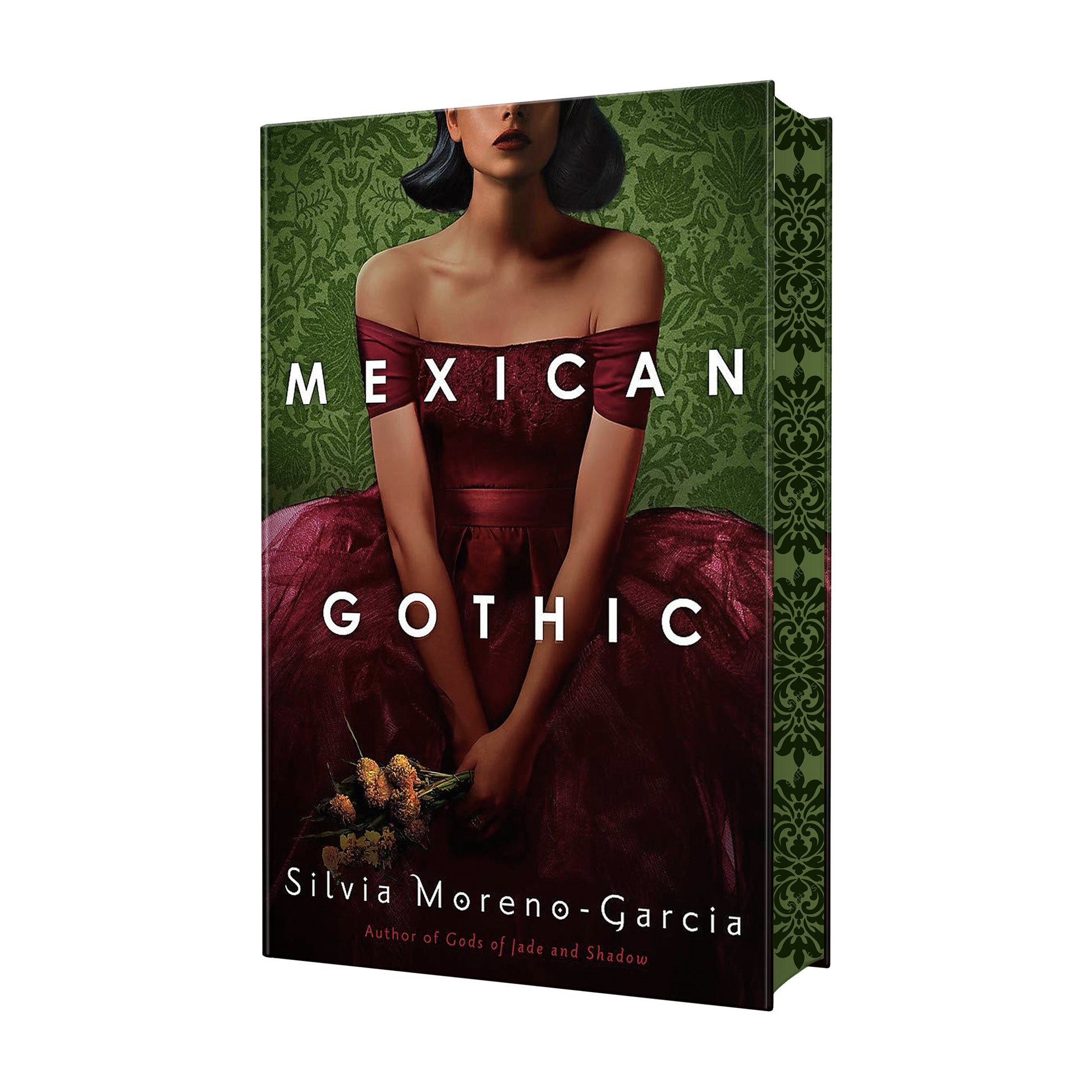 This customised edition of ”Mexican Gothic by Silvia Moreno-Garcia” will come with this gorgeous design on the front, and plain coloured edges on the top and bottom.